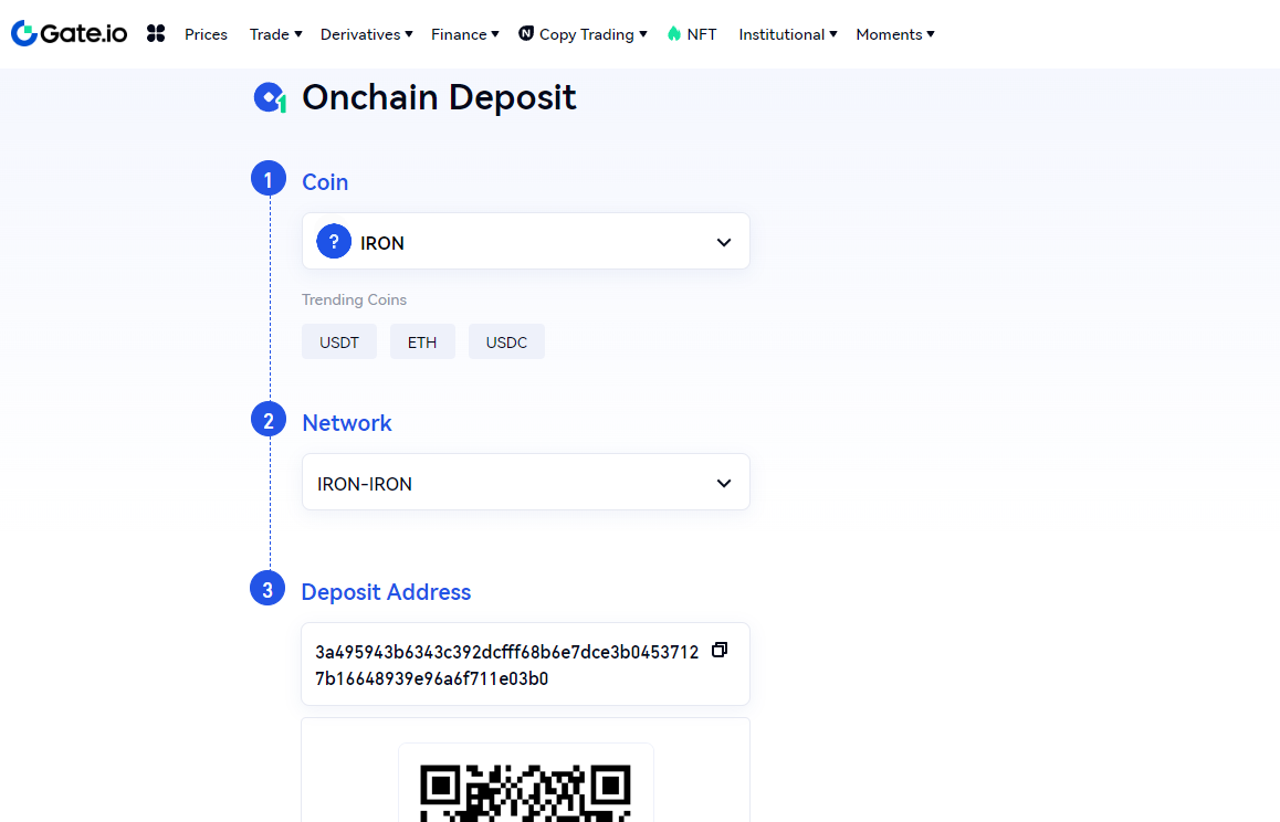 포스팅 작성 시점에 쿠코인은 $IRON 입금이 일시 중지된 상태라 Gate.io에서 입금 주소를 생성하겠습니다.