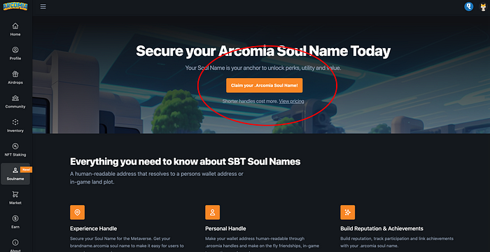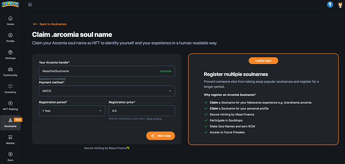 Masa의 Soulbound Token 프로토콜에 힘입어 Arcomia는 게이머의 지갑, 게임 내 업적 및 게임 내 랜드 플롯을 손쉽게 연결하는 쉽게 알아볼 수 있는 주소인 “.arcomia” soulname을 출시했습니다. 5개 이상의 문자 .arcomia 이름은 무료이며 가스만 지불하면 됩니다.