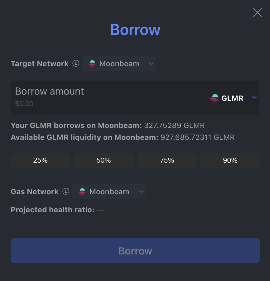 입금에는 약 20분이 소요됩니다. 입금이 완료되면 Borrow를 클릭합니다. 네트워크에서 Moonbeam을 선택하고 원하는 수량을 입력합니다. 최소 20불 이상 차입해야 합니다.