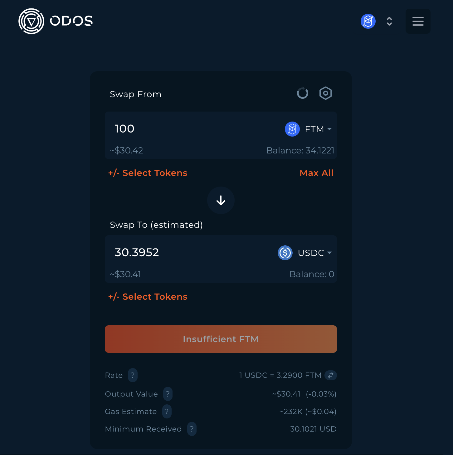 - 최소 85 FTM 이상 Odos에서 스왑