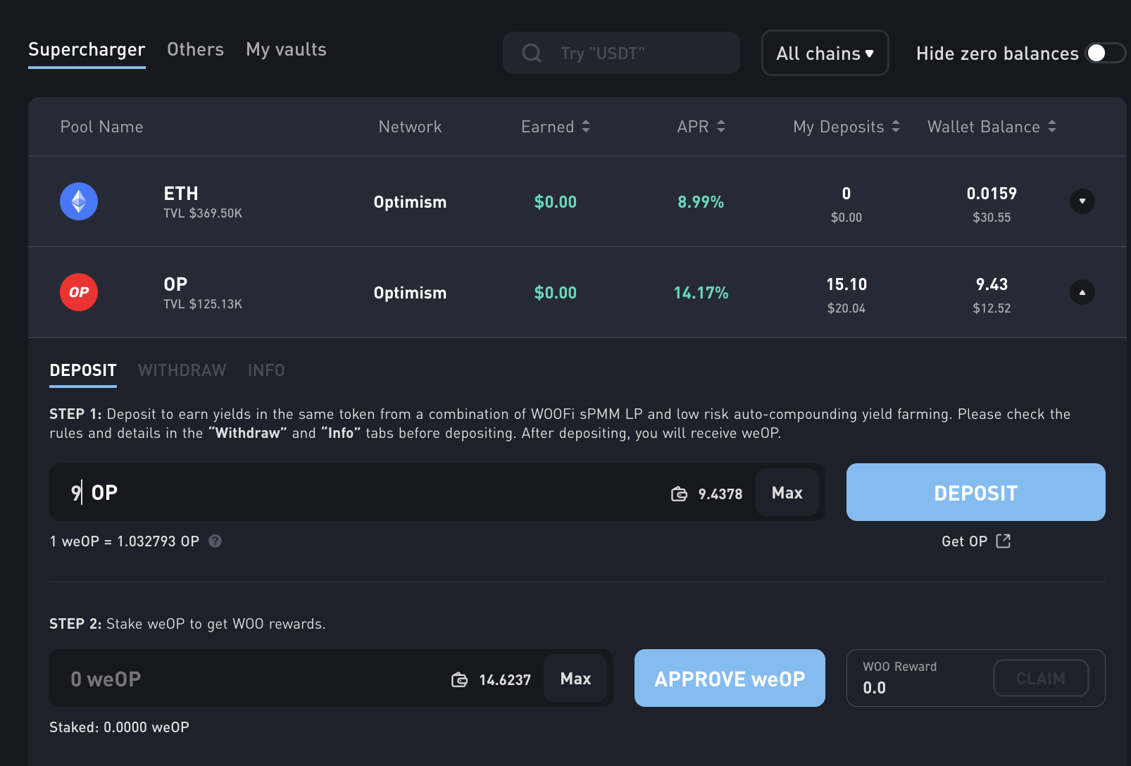 두 번째로 Earn 메뉴를 클릭합니다. 아래 Supercharger에서 OP를 선택하여 8 OP 이상을 입금합니다.