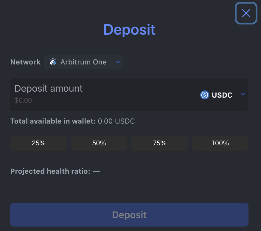Overivew 메뉴의 Deposit을 클릭합니다. 저는 아비트럼에서 USDC를 입금해보겠습니다. 여유있게 100불 정도 하는 것을 추천드립니다.