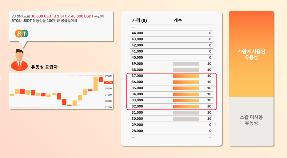 판게아 스왑에서는 유니스왑 V3의 집중된 유동성을 통한 높은 유동성 활성율을 달성하고자 합니다. 유동성 공급자는 스왑이 이루어지는 가격 구간에 집중해서 유동성을 공급할 수 있어 보다 많은 유동성이 실제 스왑에 활용될 수 있습니다. 이는 하락장에서도 고효율로 유동성을 움직여 높은 수수료 수익을 얻을 수 있기에 클레이튼 내의 고질성적인 유동성 문제를 해결할 수 있습니다.