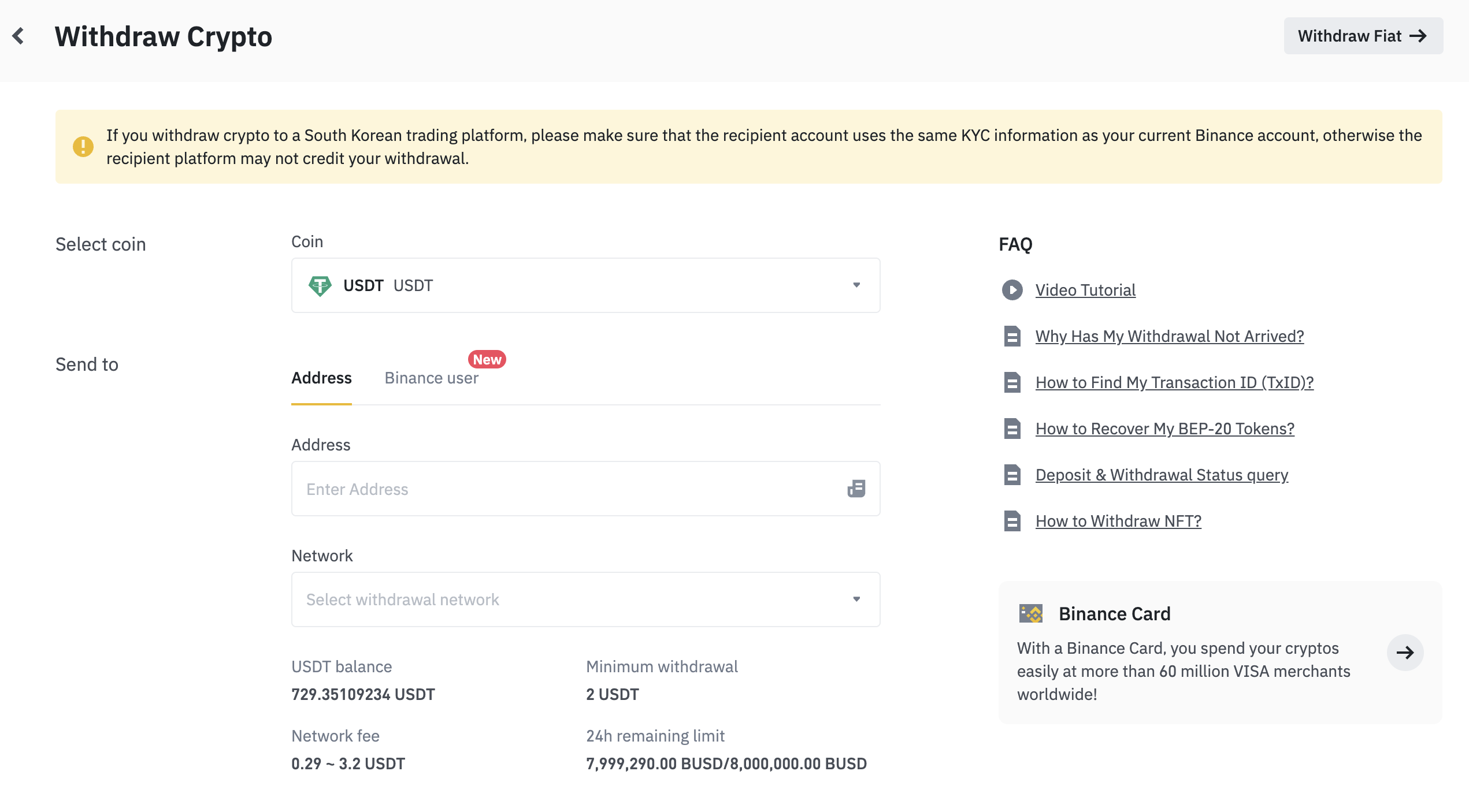 바이낸스에서 보유한 USDT를 발급한 AAX 입금 주소에 전송합니다. 이메일과 핸드폰 인증 후 정상 출금을 확인할 수 있습니다.