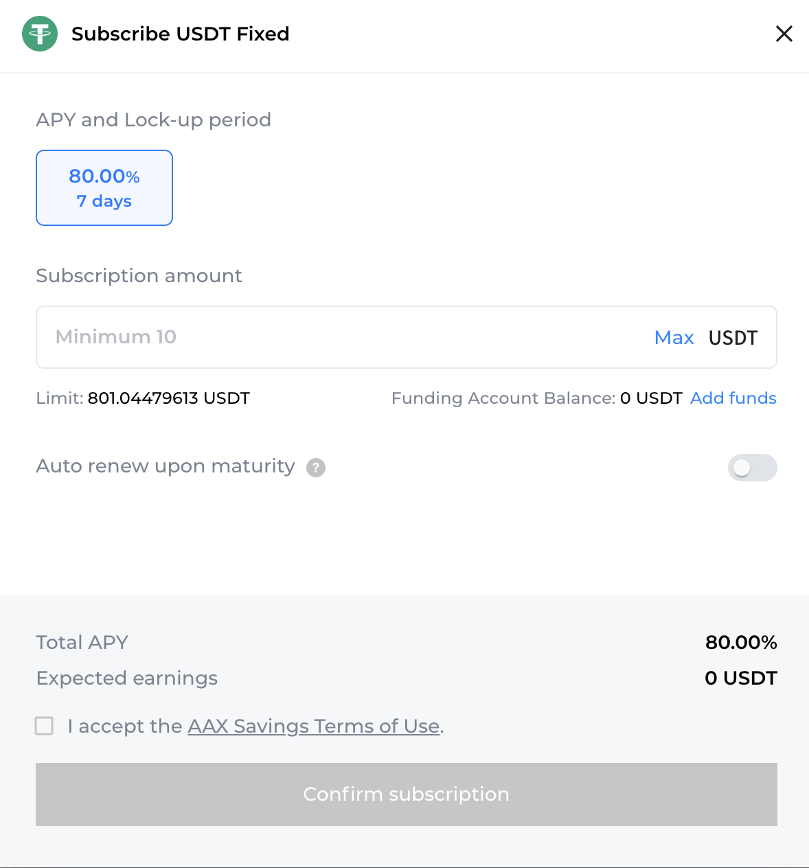 AAX의 fixed saving 상품에 스테이블코인 (BUSD, USDT, USDC, DAI)을 예치하고 일주일 동안 최대 80% APY 고정 이율을 받는 상품이 있습니다. 최근 분위기 안좋은 시장에서 높은 APY에 매력을 느끼고 참여하고자 하는 분들이 많으실텐데요. 계좌에 놀고 있는 소액의 스테이블 코인으로 fixed saving에 참여하시면서 입금 이벤트도 같이 해보시면 좋을 것 같아 추천드립니다!