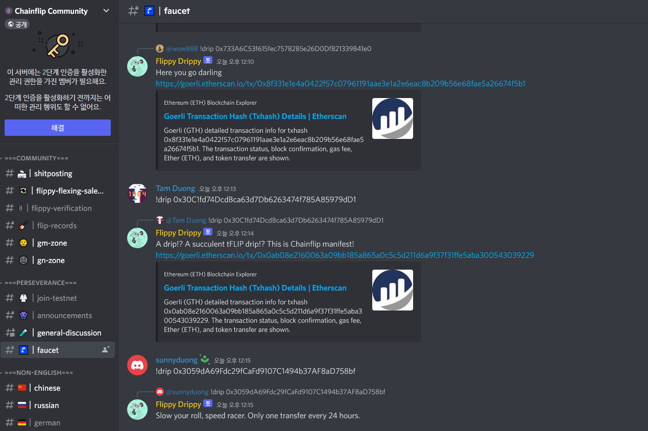 gETH를 받으셨다면 Chainflip 디스코드에 가입하여 verify를 하고 #faucet 채널에 들어갑니다.