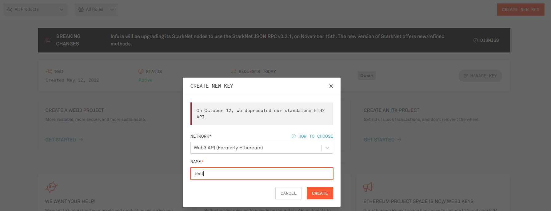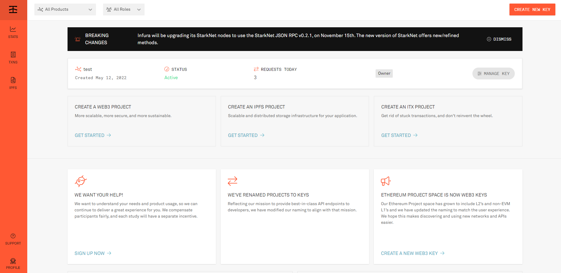 우측 상단의 "CREATE NEW KEY"를 누르고 NETWORK와 NAME을 설정합니다. NETWORK는 Web3 API를 선택합니다.