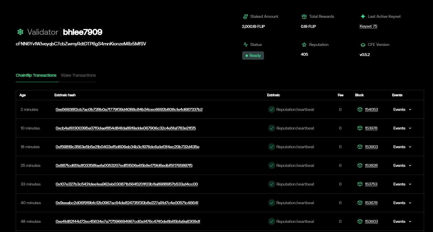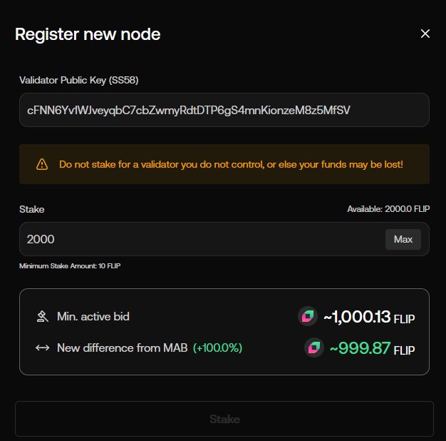 Generating Keys 단계에서 생성한 Validator ID를 입력합니다. your Public Key(SS58) 필드의 값과 동일합니다. 원하는 수량 만큼 "Stake" 를 눌러 스테이킹합니다. (현재 스테이킹에 필요한 최소 $FLIP은 1,000 이상입니다.)