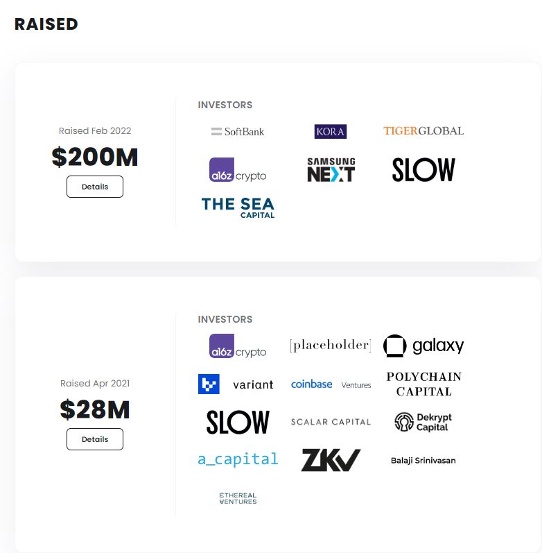 프라이빗 어플리케이션을 위한 분산형 플랫폼인 Aleo는 2021년 4월에 $28M, 2022년 2월에는 $200의 투자금을 확보하였습니다. 투자사도 타이거글로벌, a16z, 소프트뱅크, 삼성넥스트(직접 투자는 아니라고 합니다.), 투자금도 굉장히 크고 폴리체인 캐피탈 등 실적이 높은 투자사들이 많이 포진되어 있는 것을 볼 수 있습니다.