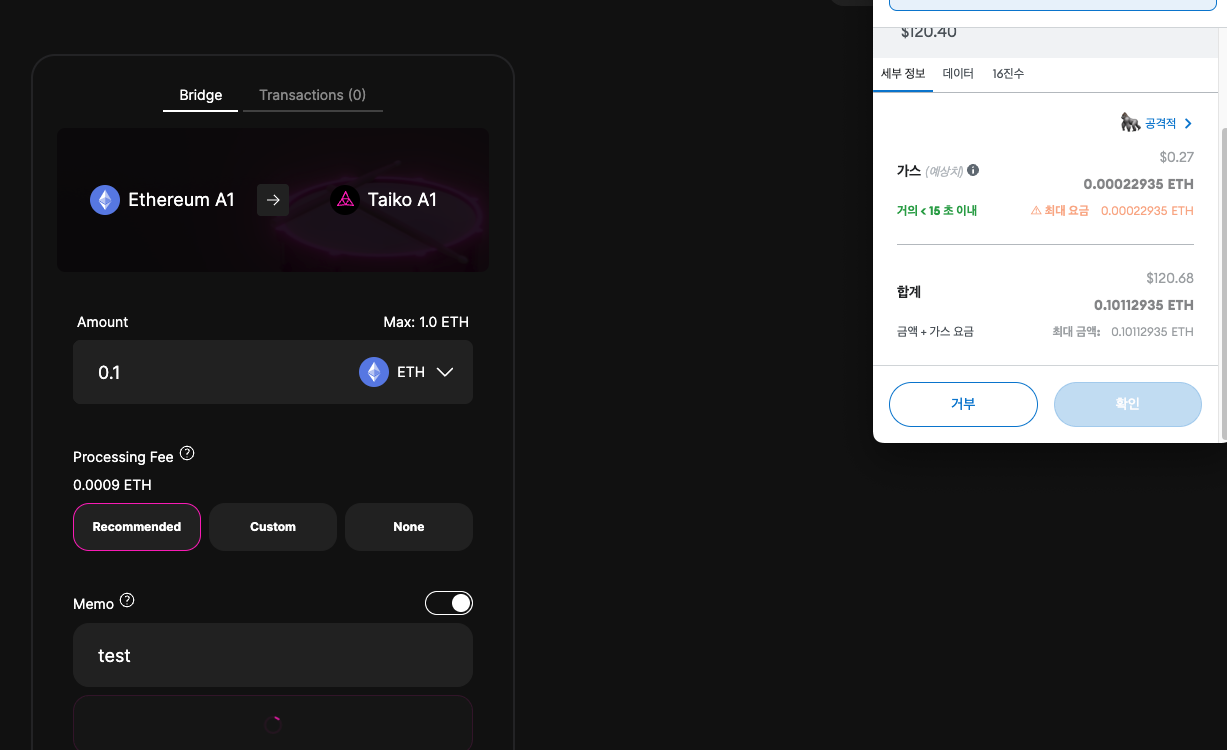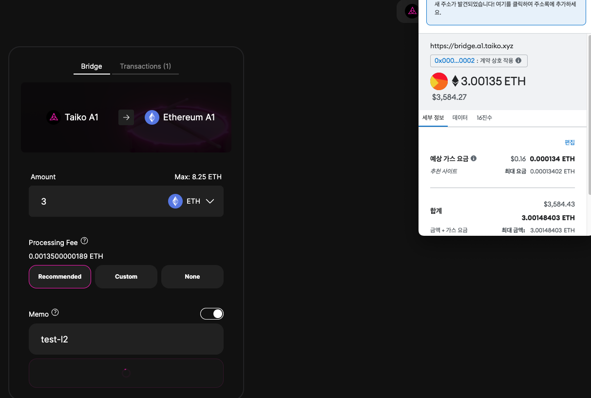 Ethereum A1 → Taiko A1으로 브릿지 트랜잭션을 요청합니다. Amount에 적절한 수량을 입력하고 아래와 같이 Processing Fee를 선택합니다.