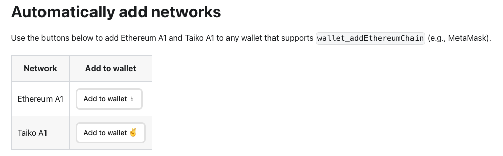 - 네트워크 추가가 되지 않을 경우 아래 화면과 같이 https://taiko.xyz/docs/alpha-1-testnet/configure-wallet 에서 Add to wallet 버튼을 눌러 네트워크를 추가합니다.