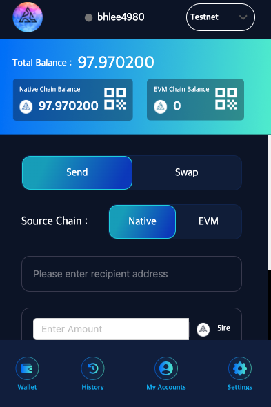 Swap from native chain to EVM: native -> EVM 스왑 미션입니다. 5ire Wallet에서 Swap을 눌러 Native -> EVM으로 약간의 $IRE를 스왑하고 완료 화면이나 익스플로러 화면을 캡처하여 업로드합니다.