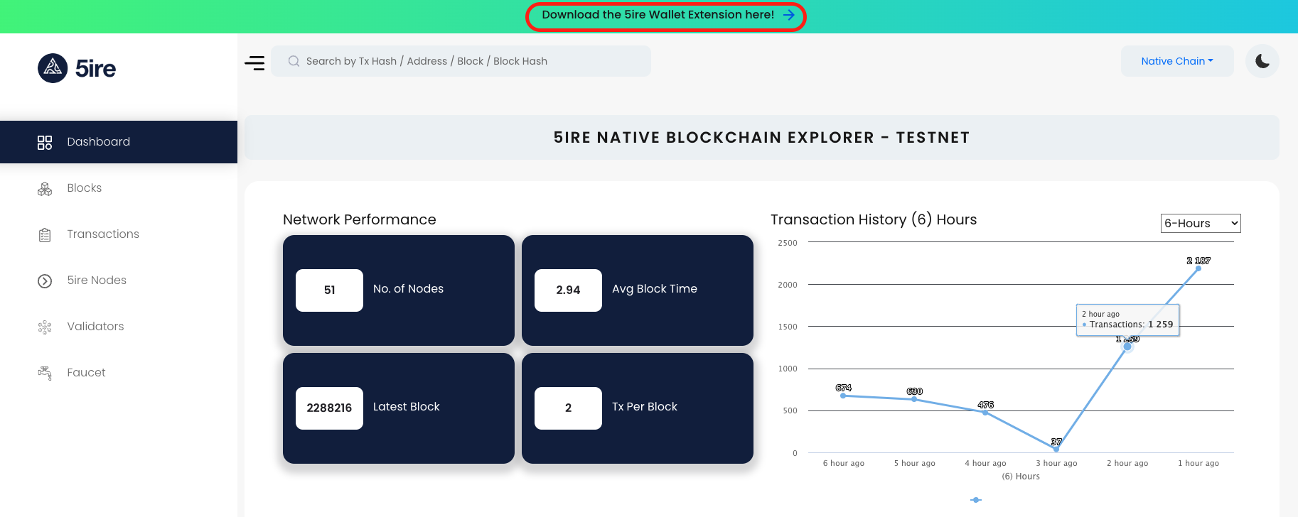 먼저 5ire wallet 확장 프로그램 설치가 필요합니다. https://explorer.5ire.network/ 에 접속합니다. 아래와 같이 페이지 상단의 "Download the 5ire Wallet Extension here!"를 클릭하여 5ire wallet 압축 파일을 다운로드합니다.