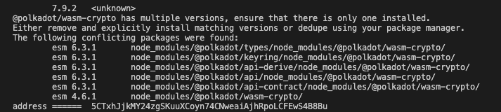 명령어를 실행하면 패키지명이 쭉 뜨다가 마지막에 native 주소가 하나 출력됩니다. 이렇게 되면 컨트랙트 코드 배포가 완료된 것입니다. 처음에는 주소 출력 후에 아무런 반응이 없어서 잘못하고 있나 생각했는데 코드를 보니 컨트랙트 배포 트랜잭션이 블록에 담기고 해당 블록이 확정되면 주소를 출력하게 작성이 되어 있어서 정상 실행되었다는 것을 알 수 있었습니다. ("Finished" 하나 로그로 찍어주는 게 그렇게 귀찮았나...)