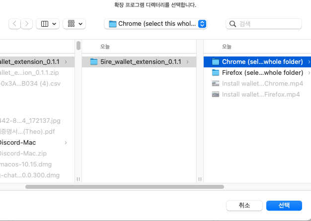 압축 해제한 5ire Wallet을 선택합니다. 아래와 같이 최종 경로가 "Chrome (select this whole folder)"가 되도록 선택해야 브라우저에서 확장 프로그램을 인식합니다.