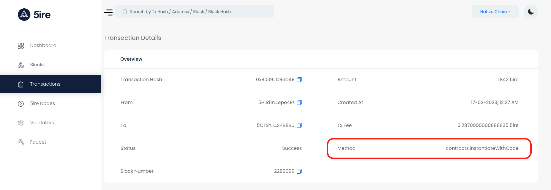 수정한 파일을 저장하고 wasm-contract-deployment 디렉토리에서 아래 명령어를 입력하여 5ireChain에 배포합니다.