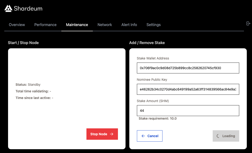 웹 기반 대시보드에서 노드 상태가 "Standby"로 변경되었는지 확인하고 밸리데이터 참여를 위해 아래와 같이 10 $SHM 이상을 스테이킹합니다.