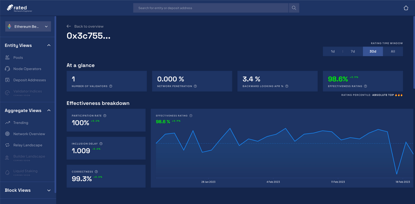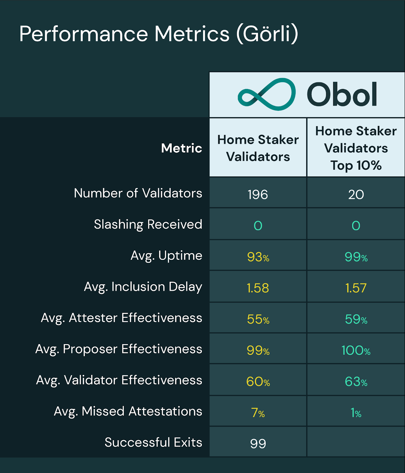 DV494484.eth라는 이름을 가진 validator는 아일랜드, 에스토니아 및 캐나다에서 운영되는 노드로 구성됩니다. 각 노드는 순수한 검증 형태인 집에서 완전히 운영됩니다. 첫 DV 활성화 이후, 이것은 2023년 2월 22일 기준으로 평균 효율성 98.6%와 함께 10,860개의 성공적인 증명서(attestations)를 누적하여 멋진 성과를 보여주었습니다. 더 중요한 것은 지리적 다양성에도 불구하고, validator는 1.021의 네트워크 평균보다 짧은 경쟁력있는 평균 포함 거리 1.009를 보여줍니다.