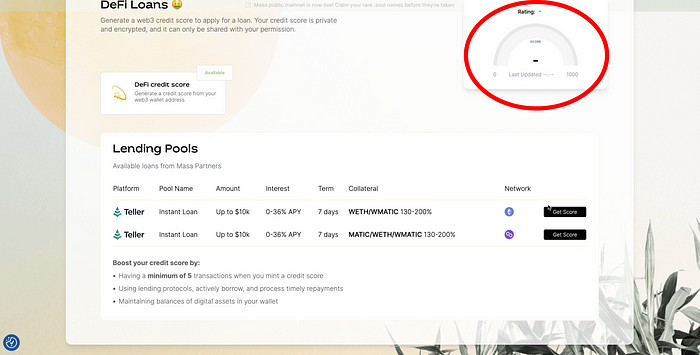 사용자가 Masa에서 web3 신용 점수 SBT를 생성하면 Ethereum과 Polygon 모두에서 사용할 수 있는 대출 풀이 표시됩니다.그들은 Masa 대시보드에서 Teller 대출 풀을 방문 하고 다른 많은 DeFi 대출 프로토콜보다 낮은 담보 비율로 즉시 대출을 생성할 수 있습니다.