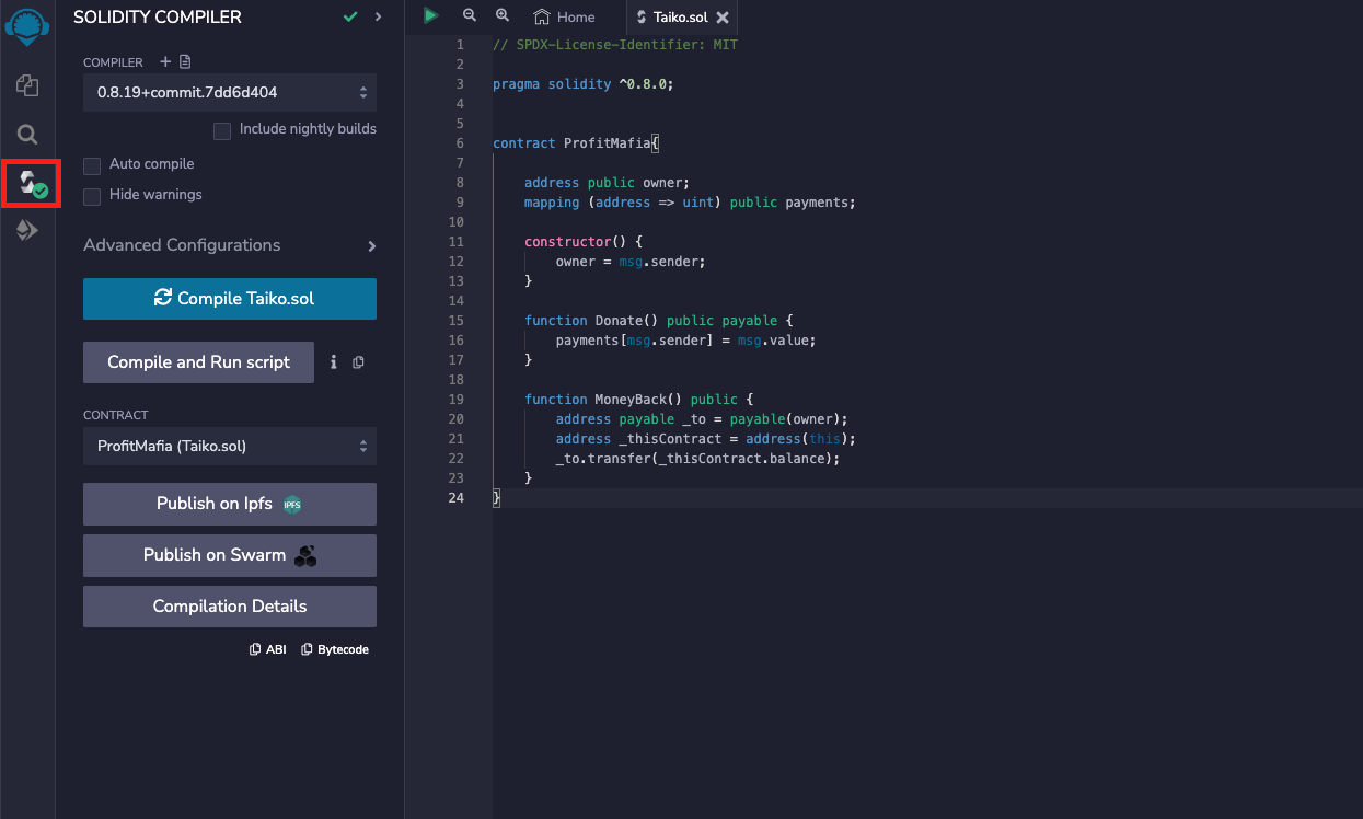 아래 사진처럼 좌측 Solidity Compiler 메뉴를 클릭합니다. 컴파일러 버전을 가장 상위 버전으로 선택한 뒤 Compile Taiko.sol 버튼을 클릭하여 컨트랙트를 컴파일 합니다. 정상적으로 컴파일되면 녹색 V 표시가 표시됩니다.