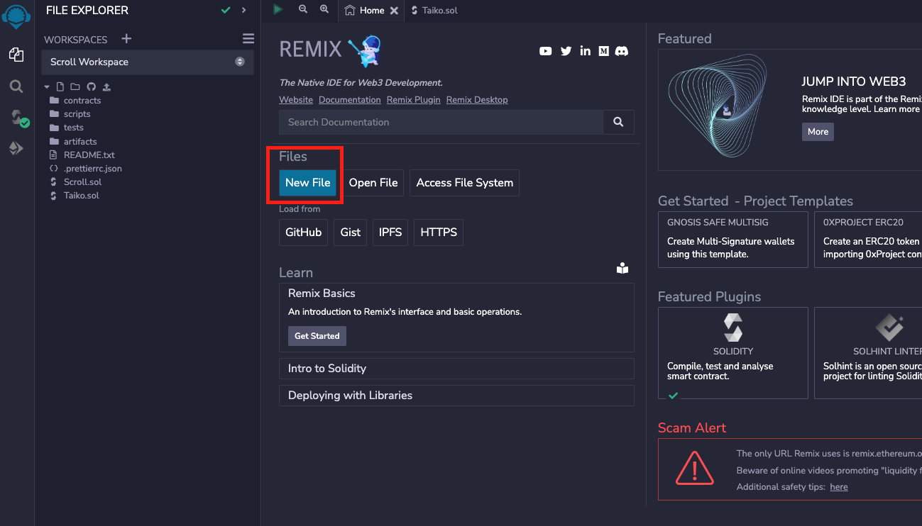 Files > New File 을 클릭하여 새 컨트랙트를 생성합니다. 저는 Taiko.sol로 지정하였습니다.