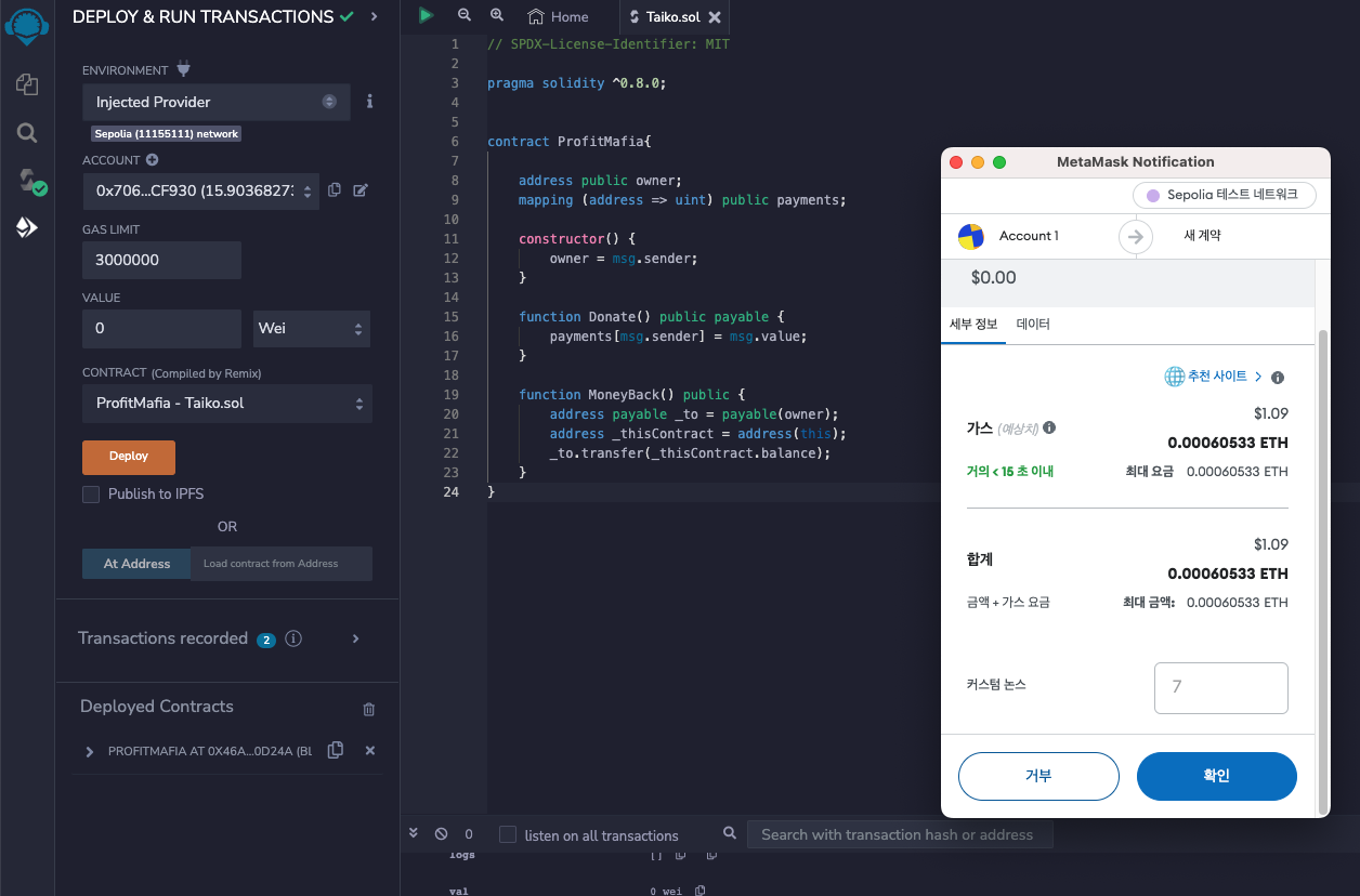 메타마스크에서 배포 트랜잭션을 승인하고 해당 트랜잭션이 확정될 때까지 기다립니다. 빠른 확정을 위해서 Gwei를 올려서 트랜잭션을 실행하시길 추천드립니다.