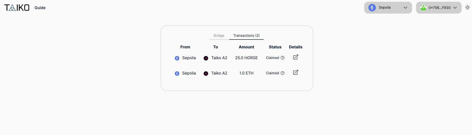 브릿징은 Sepolia에서 한 번 일어나고, Taiko A2에서 릴레이 트랜잭션이 승인되어야 브릿징한 자산을 Taiko A2에서 확인할 수 있습니다. Taiko A2에 처음 연결한 분이라면 잔액이 없기 때문에 재단이 운영하는 릴레이어가 트랜잭션을 릴레이해줄 때까지 기다려야 합니다. (시간이 좀 걸릴 수 있습니다.)